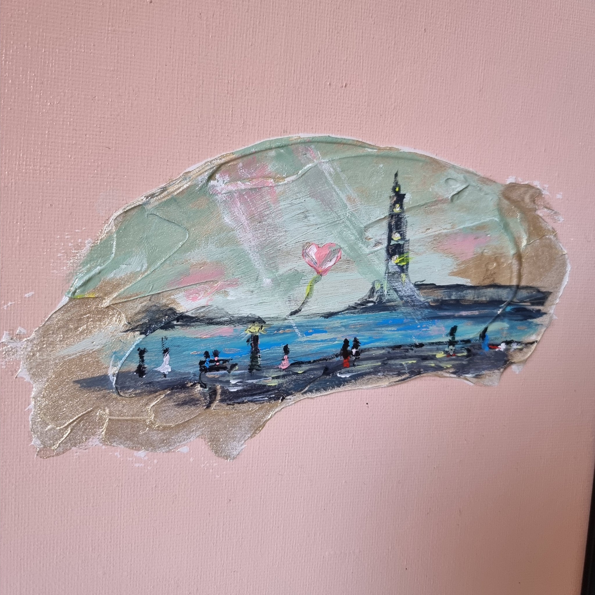 Bring a touch of calm and coastal charm to your space with this unique mixed media painting. Set against a soft pink background, the textured brushstrokes depict a serene seaside scene with a distant lighthouse and gentle pastel tones. The minimalist composition and expressive texture make it a perfect statement piece for modern interiors.